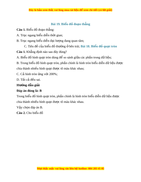 Đây là bản xem th , vu ử i lòng mua tài li u ệ đ xe ể m chi ti t (c ế ó l i ờ gi i ả ) Bài 19. Bi u đ ể đo ồ n t ạ h ng ẳ Câu 1. Bi u ể đồ đo n ạ th ng: ẳ A. Tr c ngang ụ bi u ể di n t ễ h i ờ gian; B. Tr c ngang bi ụ u di ể n đ ễ i ạ lư ng ợ đang quan tâm; C. Tiêu đề c a bi ủ u đ ể ồ thư ng ờ bên ở