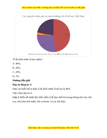 Các nguyên nhân gây tai n n ạ thư n ơ g tích ở tr ẻ em Vi t ệ Nam 20.00% 2.00% 2.00% 48.00% 28.00% Đu i ố nư c ớ Tai n n ạ giao thông Ngã Ng ộ đ c ộ Thư ng ơ tích khác Tỉ lệ đuối nư c l ớ à bao nhiêu? A. 48%; B. 28%; C. 20%; D. 2%. Hư ng d ớ ẫn gi i ả Đáp án đúng là: A D a ự vào bi u đ ể ồ ta th y t ấ l ỉ đu ệ i ố nư c ớ t ở r em ẻ là 48%. V y ậ ch n đáp án ọ A. Câu 3. Bi u ể đồ dư i ớ đây bi u di ể n t ễ ỉ l t ệ heo th t