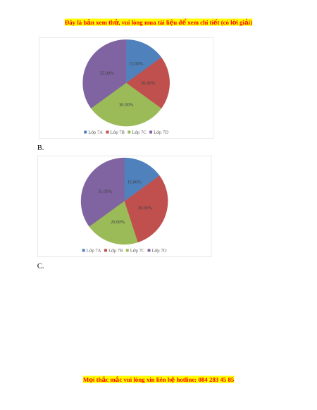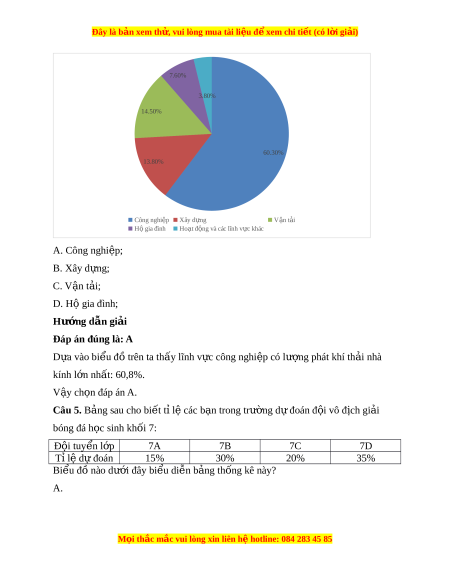 Đây là bản xem th , vu ử i lòng mua tài li u ệ đ xe ể m chi ti t (c ế ó l i ờ gi i ả ) 7.60% 3.80% 14.50% 60.30% 13.80% Công nghi p ệ Xây dựng V n ậ t i ả H ộ gia đình Ho t ạ đ ng ộ và các lĩnh vực khác A. Công nghi p ệ ; B. Xây d ng; ự C. V n ậ t i ả ; D. Hộ gia đình; Hư ng d ớ ẫn gi i ả Đáp án đúng là: A D a ự vào bi u đ ể ồ trên ta th y l ấ ĩnh v c công nghi ự p có l ệ ư ng ợ phát khí th i ả nhà kính l n nh ớ ất: 60,8%. V y ậ ch n đáp án ọ A. Câu 5. B ng s ả au cho bi t ế tỉ l các ệ b n t ạ rong trư ng ờ d đoán đ ự i ộ vô đ ch gi ị i ả bóng đá h c ọ sinh khối 7: Đ i ộ tuy n l ể p ớ 7A 7B 7C 7D Tỉ lệ d đoán ự 15% 30% 20% 35% Bi u ể đồ nào dư i ớ đây bi u di ể n b ễ ng ả th ng kê ố này? A. M i