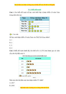 Đây là bản xem th , vu ử i lòng mua tài li u ệ đ xe ể m chi ti t ế (có l i ờ gi i ả ) D .3. B i u ể đ t ồ ranh Câu 1. Cho bi u ể đồ tranh số h c ọ sinh kh i ố l p ớ 6 đư c ợ đi m ể 10 môn Toán trong tu n nh ầ s ư au: Số h c ọ sinh đư c ợ đi m ể 10 môn Toán vào Th ứ T l ư à bao nhiêu? A. 1 B. 2 C. 5 D. 4 Câu 2. Bi u ể đồ tranh dư i ớ đây cho bi t