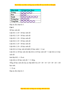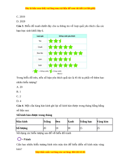 ả áo là 45 thì số táo tăng thêm là: 45 – 25 = 20 (h c ọ sinh) Số bi u t ể ư ng ợ c n v ầ l ẽ à 20:10=2 (bi u t ể ư ng) ợ V y ph ậ i ả v t ẽ hêm 2 bi u t ể ư ng ngôi ợ sao. Đáp án cần ch n ọ là: C Câu 4. Màu tr ng có ắ 20 chi c, t ế a vẽ 20:5=4 hình tròn. Tư ng ơ tự v i