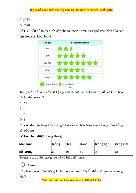 Đây là bản xem th , vu ử i lòng mua tài li u ệ đ xe ể m chi ti t ế (có l i ờ gi i ả ) C. 2019 D. 2020 Câu 3. Bi u ể đồ tranh dư i ớ đây cho ta thông tin v ề lo i ạ qu ả yêu thích c a ủ các b n h ạ c ọ sinh khối l p 6. ớ Trong bi u ể đồ trên, n u ế s ố b n ạ yêu thích qu ả táo là 45 thì ta ph i ả v ẽ thêm bao nhiêu bi u t ể ư ng? ợ A. 20 B. 1 C. 2 D. 4 Câu 4. M t ộ c a ử hàng bán kính ghi l i ạ số kính bán đư c t ợ rong tháng b ng b ằ ng ả số liệu sau: S kí ố nh bán đư c t ợ rong tháng Màu kính Trắng Đen Xanh Trắng bạc Vàng kim Số lư ng ợ 20 10 30 15 25 S d ử ng các bi ụ u ể tư ng s ợ au đ v ể b ẽ i u ể đ t ồ ranh Cần bao nhiêu bi u ể tư ng