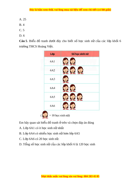 Đây là bản xem th , vu ử i lòng mua tài li u ệ đ xe ể m chi ti t ế (có l i ờ gi i ả ) A. 25 B. 4 C. 5 D. 6 Câu 5. Bi u ể đồ tranh dư i ớ đây cho bi t ế số h c ọ sinh nữ c a ủ các l p ớ kh i ố 6 trư ng ờ THCS Hoàng Vi t ệ . Em hãy quan sát bi u đ ể ồ tranh t
