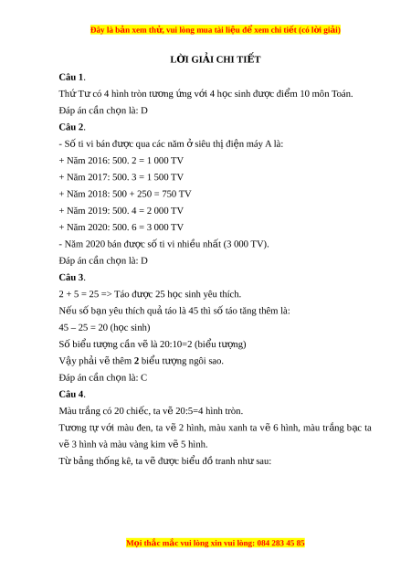 Đây là bản xem th , vu ử i lòng mua tài li u ệ đ xe ể m chi ti t ế (có l i ờ gi i ả ) L I Ờ GIẢI CHI TI T Ế Câu 1. Th ứ T có 4 hì ư nh tròn tư ng ơ ng v ứ i ớ 4 h c s ọ inh đư c đi ợ m ể 10 môn Toán. Đáp án cần ch n ọ là: D Câu 2. - Số ti vi bán đư c qua ợ các năm s ở iêu th đi ị n m ệ áy A là: + Năm 2016: 500. 2 = 1 000 TV + Năm 2017: 500. 3 = 1 500 TV