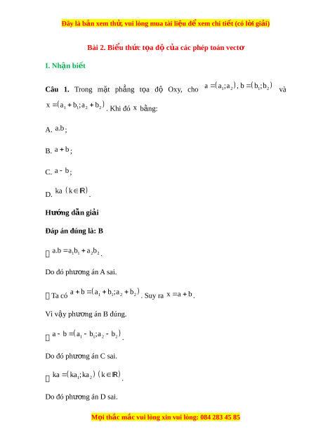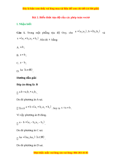 ử vui lòng mua tài li u ệ đ ể xem chi ti t ế (có l i ờ gi i ả ) Bài 2. Bi u t ể h c t ứ a đ ọ c ộ a các ủ phép toán vectơ I. Nhận bi t ế Câu 1. Trong m t ặ ph ng ẳ t a ọ độ Oxy, cho a a ;a , b b ;b 1 2 1 2 và x a b ;a b 1 1 2 2 . Khi đó x b ng: ằ A. a.b ; B. a b ; C. a b ; D. ka k . Hư ng ớ d n gi ẫ i ả Đáp án đúng là: B ⦁ a.b a b a b 1 1 2 2 . Do đó phư ng án ơ A sai. ⦁ Ta có a b a b ;a b 1 1 2 2 . Suy ra x a b . Vì v y ph ậ ư ng ơ án B đúng. ⦁ a b a b ;a b 1 1 2 2 . Do đó phư ng án C ơ sai. ⦁ ka ka ;ka k 1 2 . Do đó phư ng án D ơ sai. Mọi th c ắ m c