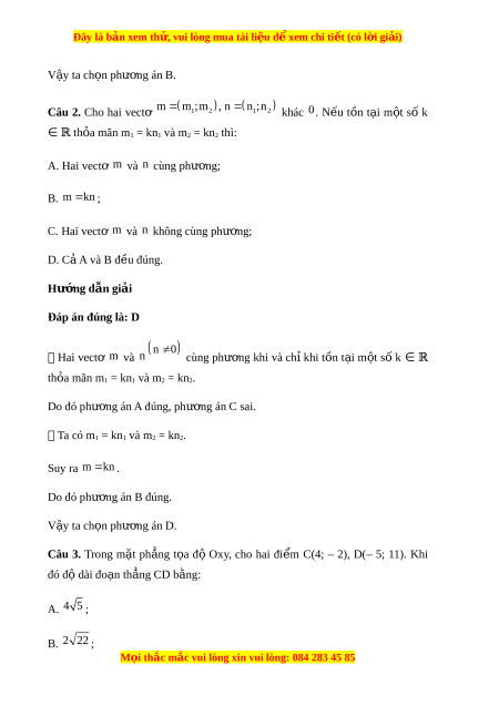 ⦁ Ta có m1 = kn1 và m2 = kn2. Suy ra m k n . Do đó phư ng ơ án B đúng. V y ậ ta ch n ph ọ ư ng ơ án D. Câu 3. Trong m t ặ ph ng ẳ t a ọ độ Oxy, cho hai đi m
