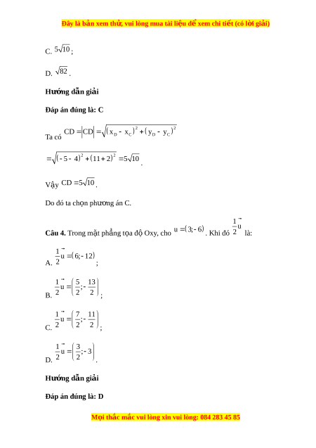 ử vui lòng mua tài li u ệ đ ể xem chi ti t ế (có l i ờ gi i) ả 1 1 1 u .3; . 6 Ta có 2 2 2 . 1 3 u ; 3 Suy ra 2 2 . V y ậ ta ch n ph ọ ư ng ơ án D. Câu 5. Trong m t ặ ph ng ẳ t a ọ độ Oxy, cho x 10;2 , y 5;8 . Khi đó x.y b ng: ằ A. –34; B. (–50; 16); C. –66; D. 34. Hư ng d ớ ẫn gi i ả Đáp án đúng là: A G i ọ x x ; x 10;2 , y y ; y 5;8 1 2 1 2 . Ta có x.y x .y x .y 1 0. 5 2.8 34 1 1 2 2 . V y ậ x.y 34 . Do đó ta ch n ọ phư ng án ơ A. Câu 6. Trong m t ặ ph ng ẳ t a ọ đ ộ Oxy, cho hai đi m