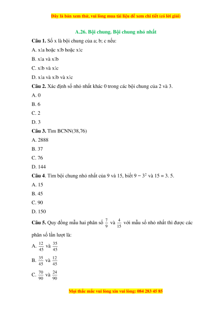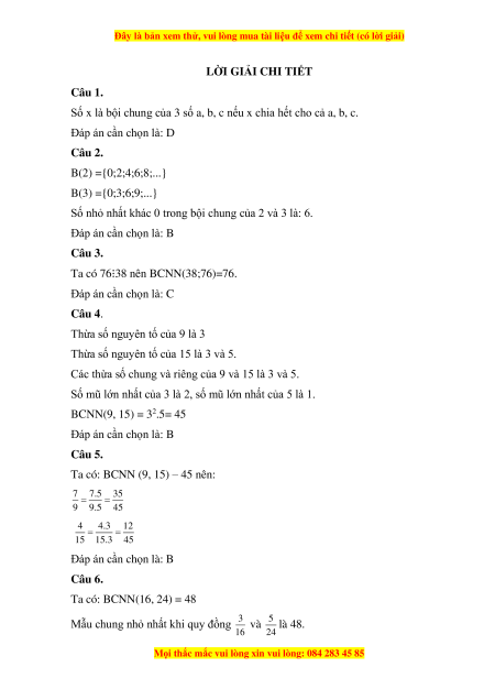 Ta có: BCNN (9, 15) – 45 nên: 7 7.5 35 = = 9 9.5 45 4 4.3 12 = = 15 15.3 45 Đáp án cần chọn là: B Câu 6. Ta có: BCNN(16, 24) = 48