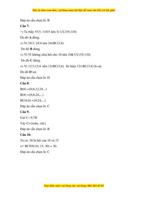 Câu 7. Chọn câu trả lời sai. A. 5∈ ƯC(55;110) B. 24∈BC(3;4) C. 10∉ ƯC(55;110) D. 12⊂BC(3;4)