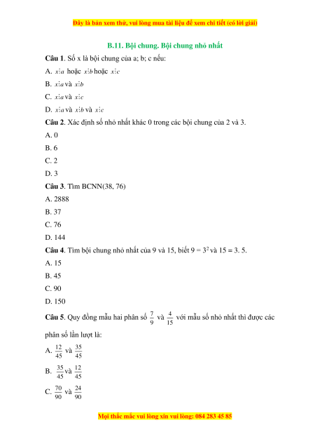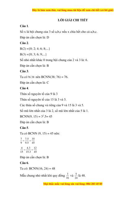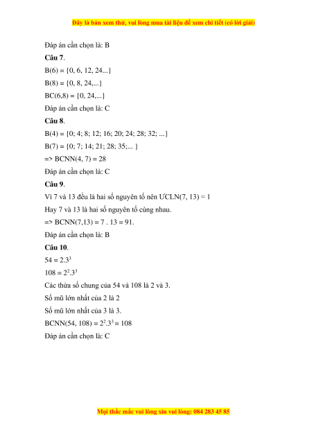Đáp án cần chọn là: B Câu 7. B(6) = {0, 6, 12, 24...} B(8) = {0, 8, 24,...} BC(6,8) = {0, 24,...} Đáp án cần chọn là: C Câu 8.