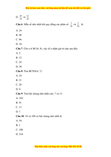Câu 6. Mẫu số nhỏ nhất khi quy đồng các phân số và là 16 24 A. 24 B. 48 C. 96 D. 16