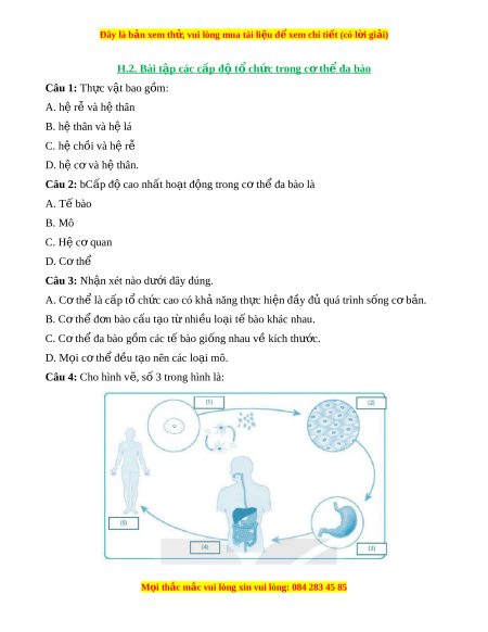 Đây là bản xem th , vu ử i lòng mua tài li u ệ đ xe ể m chi ti t (c ế ó l i ờ gi i ả ) H .2. B ài t p các ậ c p đ ấ ộ t ch ổ c ứ trong c t ơ h đ ể a bào Câu 1: Th c ự v t ậ bao gồm: A. hệ r và h ễ ệ thân B. hệ thân và hệ lá C. hệ chồi và h r ệ ễ D. hệ cơ và hệ thân. Câu 2: bCấp đ cao ộ nhất ho t ạ đ ng t ộ rong cơ th đa bào l ể à A. T bào ế B. Mô C. Hệ c quan ơ D. Cơ thể Câu 3: Nh n xét ậ nào dư i ớ đây đúng. A. Cơ th l ể à c p t ấ ch ổ c cao có ứ kh năng t ả h c ự hi n đ ệ y đ ầ quá t ủ rình s ng c ố b ơ n. ả B. C t ơ hể đ n bào c ơ u t ấ o t ạ nhi ừ u l ề o i ạ t bào khác nhau. ế C. C t ơ hể đa bào g m ồ các t bào gi ế ng nhau v ố kí ề ch thư c. ớ D. M i ọ c t ơ h đ ể u ề t o nên các ạ lo i ạ mô.