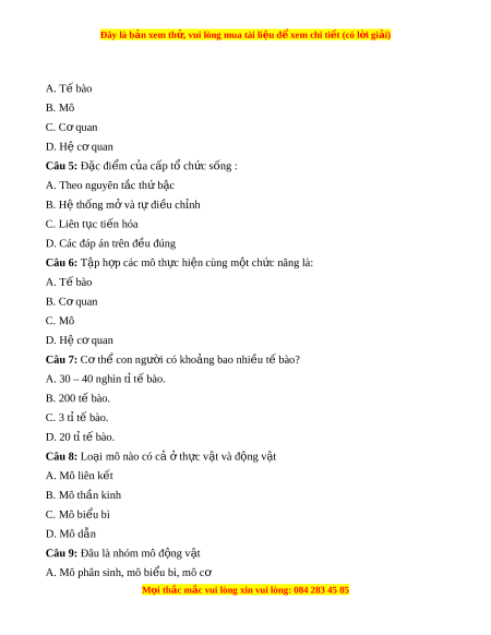 Đây là bản xem th , vu ử i lòng mua tài li u ệ đ xe ể m chi ti t (c ế ó l i ờ gi i ả ) A. T bào ế B. Mô C. C quan ơ D. Hệ cơ quan Câu 5: Đ c ặ đi m ể c a c ủ p t ấ ổ ch c s ứ ống : A. Theo nguyên t c ắ th b ứ c ậ B. Hệ thống m và ở t đi ự u ch ề nh ỉ C. Liên t c ụ ti n ế hóa