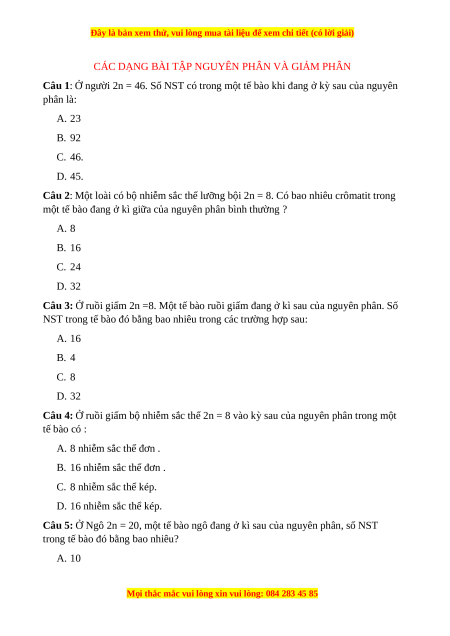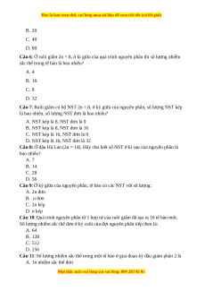 Câu 1: Ở người 2n = 46. Số NST có trong một tế bào khi đang ở kỳ sau của nguyên