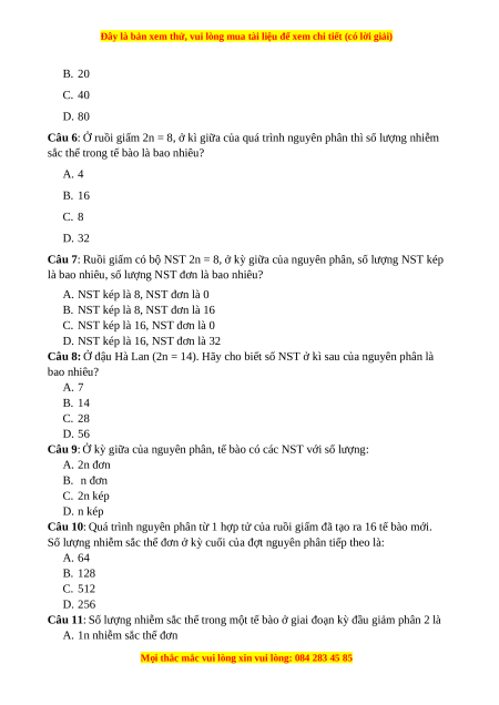 Câu 6: Ở ruồi giấm 2n = 8, ở kì giữa của quá trình nguyên phân thì số lượng nhiễm