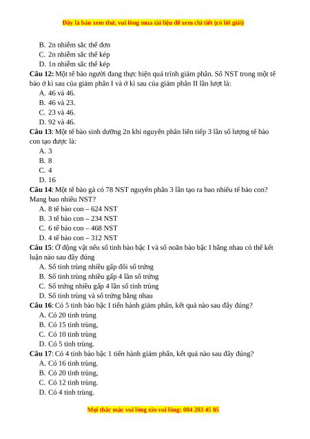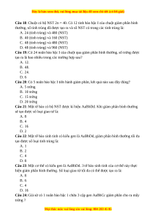 Câu 16: Có 5 tinh bào bậc I tiến hành giảm phân, kết quả nào sau đây đúng? A. Có 20 tinh trùng B. Có 15 tinh trùng, C. Có 10 tinh trùng D. Có 5 tinh trùng.