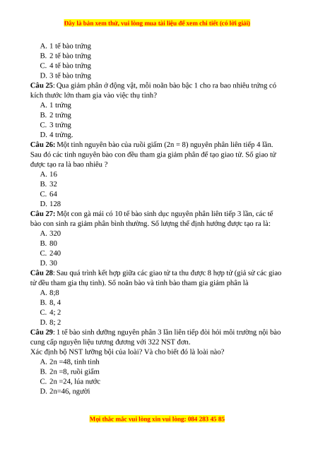 Câu 25: Qua giảm phân ở động vật, mỗi noãn bào bậc 1 cho ra bao nhiêu trứng có