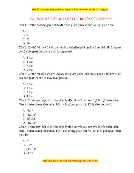CÁC DẠNG BÀI TẬP QUY LUẬT DI TRUYỀN CỦA MENĐEN