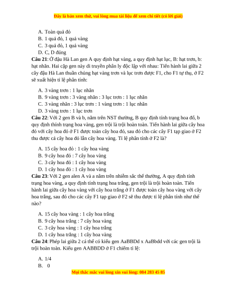 Câu 22: Với 2 gen B và b, nằm trên NST thường, B quy định tính trạng hoa đổ, b