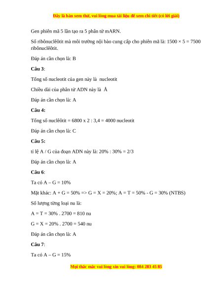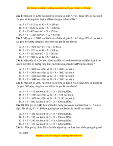 Câu 7: Một gen có 3000 nuclêôtit và có hiệu số giữa A và G bằng 15% số nuclêôtit