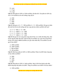 Câu 15: Một đoạn phân tử ADN có 1800 nuclêôtịt. Phân tử mARN được tổng hợp có bao nhiêu nuclêôtit? A. 3600 B. 7200. C. 1800. D. 900