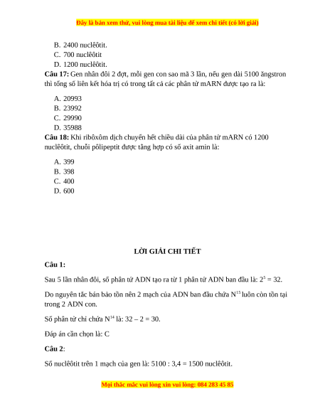 Câu 17: Gen nhân đôi 2 đợt, mỗi gen con sao mã 3 lần, nếu gen dài 5100 ăngstron
