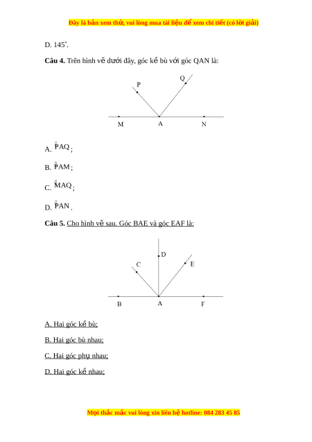 Đây là bản xem th , vu ử i lòng mua tài li u ệ đ xe ể m chi ti t ế (có l i ờ gi i ả ) D. 145. Câu 4. Trên hình v d ẽ ư i ớ đây, góc kề bù v i ớ góc QAN là: A. PAQ ; B. PAM ; C. MAQ ; D. PAN .