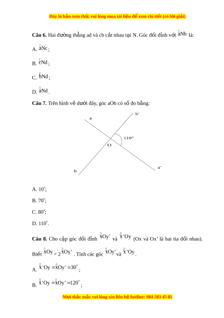 Đây là bản xem th , vu ử i lòng mua tài li u ệ đ xe ể m chi ti t ế (có l i ờ gi i ả ) Câu 6. Hai đư ng t ờ h ng ẳ ad và cb c t ắ nhau t i ạ N. Góc đ i ố đ nh v ỉ i ớ aNb là: A. aNc ; B. cNd ; C. bNd ; D. aNd . Câu 7. Trên hình v d ẽ ư i