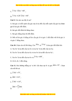 Câu 9. Câu nào sau đây là sai? A. Hai góc có mỗi c nh c ạ a ủ góc này là tia đ i ố c a m ủ i ỗ c nh ạ c a góc ki ủ a đư c ơ g i o là hai góc đối đ nh; ỉ B. Hai góc đối đ nh t ỉ hì b ng nhau; ằ C. Hai góc b ng nhau t ằ hì đ i ố đ nh; ỉ D. N u ế s ố đo góc A b ng ằ s ố đo c a ủ góc B và góc C đ i ố đ nh ỉ v i ớ B thì góc A và góc C b ng nhau. ằ Câu 10. Ch n câu o trả l i