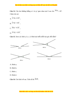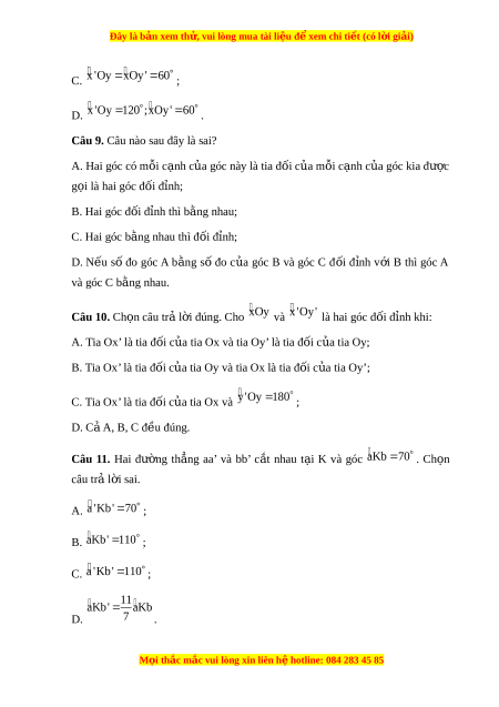 ủ ia Oy và tia Ox là tia đ i ố c a ủ tia Oy’; C. Tia Ox’ là tia đ i ố c a t ủ ia Ox và y'Oy 180 ; D. Cả A, B, C đ u đúng. ề Câu 11. Hai đư ng ờ th ng ẳ aa’ và bb’ c t ắ nhau t i ạ K và góc aKb 70 . Ch n o câu tr l ả i ờ sai. A. a 'Kb' 7 0 ; B. aKb' 1 10 ; C. a 'Kb' 1 10 ; 11 aKb' aKb D. 7 . M i ọ thắc m c
