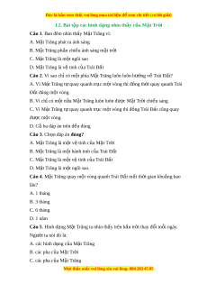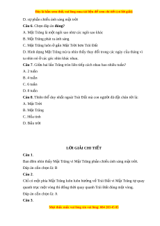 Đây là bản xem th , vu ử i lòng mua tài li u ệ đ xe ể m chi ti t ế (có l i ờ gi i ả ) D. s ph ự n ả chi u ánh s ế áng m t ặ tr i ờ Câu 6. Ch n đáp ọ án đúng? A. M t ặ Trăng là m t ộ ngôi sao nh các ư ngôi sao khác B. M t ặ Trăng phát ra ánh sáng C. M t ặ Trăng luôn g ở n M ầ t ặ Tr i ờ h n ơ Trái Đ t ấ D. Hình d ng M ạ t ặ Trăng mà ta nhìn th y t ấ hay đ i ổ trong các ngày c a t ủ háng vì ta nhìn nó các ở góc nhìn khác nhau. Câu 7. Gi a hai ữ