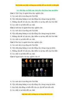 ài tập các lĩnh v c ự ch y ủ u c ế a khoa h ủ c t ọ n ự hiên Câu 1: V t ậ lí h c l ọ à ngành khoa h c ọ nghiên c u: ứ A. Các sinh v t ậ và s s ự ng t ố rên Trái Đ t ấ B. V t ậ chất,năng lư ng và s ợ ự v n đ ậ ng ộ c a chúng t ủ rong t nhi ự ên C. Nh ng ữ v n đ ấ v ề ề c u t ấ rúc, đ c ặ đi m ể và sự thay đ i ổ c a ủ Trái Đ t ấ D. Các chất và s bi ự n đ ế ổi các ch t ấ Câu 2: Sinh h c l ọ à ngành khoa h c nghi ọ ên c u: ứ A. Các sinh v t ậ và s s ự ng t ố rên Trái Đ t ấ B. V t ậ chất,năng lư ng và s ợ ự v n đ ậ ng ộ c a chúng t ủ rong t nhi ự ên C. Nh ng ữ v n đ ấ v ề ề c u t ấ rúc, đ c ặ đi m ể và sự thay đ i ổ c a ủ Trái Đ t ấ D. Các chất và s bi ự n đ ế ổi các ch t ấ Câu 3: Hóa h c l ọ à ngành khoa h c ọ nghiên c u: ứ A. Các sinh v t ậ và s s ự ng t ố rên Trái Đ t ấ B. V t ậ chất,năng lư ng và s ợ ự v n đ ậ ng ộ c a chúng t ủ rong t nhi ự ên C. Nh ng ữ v n đ ấ v ề ề c u t ấ rúc, đ c ặ đi m ể và sự thay đ i ổ c a ủ Trái Đ t ấ D. Các chất và s bi ự n đ ế ổi các ch t ấ