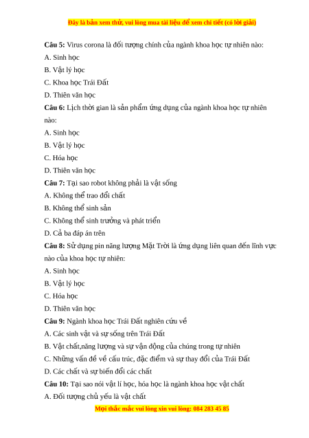 Câu 5: Virus corona là đ i ố tư ng chí ợ nh c a ngành ủ khoa h c t ọ nhi ự ên nào: A. Sinh h c ọ B. V t ậ lý h c ọ C. Khoa h c ọ Trái Đ t ấ D. Thiên văn h c ọ Câu 6: Lịch th i ờ gian là s n ả ph m ẩ ng d ứ ng c ụ a ngành ủ khoa h c t ọ nhi ự ên nào: A. Sinh h c ọ B. V t ậ lý h c ọ C. Hóa h c ọ D. Thiên văn h c ọ Câu 7: T i ạ sao robot không ph i ả là v t ậ s ng ố A. Không th t ể rao đ i ổ ch t ấ B. Không th s ể inh s n ả C. Không th s ể inh trư ng ở và phát tri n ể D. Cả ba đáp án trên Câu 8: S d ử ng pi ụ n năng lư ng M ợ t ặ Tr i ờ là ng d ứ ng l ụ iên quan đ n l ế ĩnh v c ự nào c a khoa ủ h c t ọ nhi ự ên: A. Sinh h c ọ B. V t ậ lý h c ọ C. Hóa h c ọ D. Thiên văn h c ọ