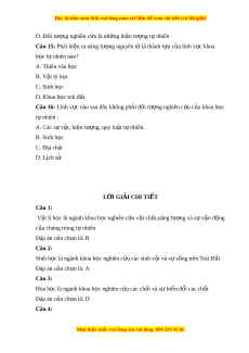 Câu 16: Lĩnh v c nào s ự au đây không ph i ả đối tư ng nghi ợ ên c u ứ c a khoa h ủ c ọ t nhi ự ên : A. Các s v ự t ậ , hi n t ệ ư ng, ợ quy lu t ậ t nhi ự ên. B. Sinh h c ọ C. Địa chât D. Lịch sử L I Ờ GIẢI CHI TI T Ế Câu 1: V t ậ lí h c ọ là ngành khoa h c nghi ọ ên c u ứ v t ậ ch t ấ ,năng lư ng ợ và s v ự n ậ đ ng ộ c a chúng t ủ rong t nhi ự ên Đáp án cần ch n ọ là: B Câu 2: Sinh h c l ọ à ngành khoa h c ọ nghiên c u các ứ sinh v t ậ và s s ự ng ố trên Trái Đ t ấ Đáp án cần ch n ọ là: A Câu 3: Hóa h c l ọ à ngành khoa h c nghi ọ ên c u ứ các ch t ấ và sự bi n đ ế ổi các ch t ấ Đáp án cần ch n ọ là: D Câu 4: M i