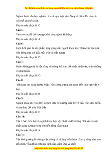 Câu 9: Ngành khoa h c ọ Trái Đ t ấ nghiên c u v ứ ề A. Các sinh v t ậ và s s ự ng t ố rên Trái Đ t ấ B. V t ậ chất,năng lư ng và s ợ ự v n đ ậ ng ộ c a chúng t ủ rong t nhi ự ên C. Nh ng ữ v n đ ấ v ề ề c u t ấ rúc, đ c ặ đi m ể và sự thay đ i ổ c a ủ Trái Đ t ấ D. Các chất và s bi ự n đ ế ổi các ch t ấ Câu 10: T i ạ sao nói v t ậ lí h c, hóa ọ h c l ọ à ngành khoa h c ọ v t ậ ch t ấ A. Đ i ố tư ng ợ ch y ủ u l ế à v t ậ ch t ấ M i