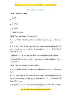 B. p F . t C. p F . t D. Cả đáp án A và B Câu 2: Ch n ọ đáp án đúng. Va ch m ạ m m ề A. x y ả ra khi hai v t ậ dính vào nhau và chuy n ể đ ng ộ v i ớ cùng v n ậ t c ố sau va ch m ạ . B. là va ch m ạ trong đó v t ậ xu t ấ hi n ệ bi n ế d ng ạ đàn h i ồ trong kho ng ả th i ờ gian va ch m ạ , sau va ch m ạ v t ậ l y ấ l i ạ hình d ng ạ ban đ u ầ và ti p ế t c ụ chuy n ể đ ng t ộ ách r i ờ nhau. C. đ ng năng ộ c a h ủ s ệ au va ch m ạ b ng ằ đ ng năng c ộ a ủ h t ệ rư c ớ va ch m ạ . D. t ng ổ đ ng ộ lư ng ợ c a ủ hệ trư c ớ và ch m ạ nh ỏ h n ơ t ng ổ đ ng ộ lư ng ợ c a ủ hệ sau va ch m ạ . Câu 3: Ch n ọ đáp án đúng. Va ch m ạ đàn hồi A. x y ả ra khi hai v t ậ dính vào nhau và chuy n ể đ ng ộ v i ớ cùng v n ậ t c ố sau va ch m ạ . B. là va ch m ạ trong đó v t ậ xu t ấ hi n ệ bi n ế d ng ạ đàn h i ồ trong kho ng ả th i ờ gian va ch m ạ , sau va ch m ạ v t ậ l y ấ l i ạ hình d ng ạ ban đ u ầ và ti p ế t c ụ chuy n ể đ ng t ộ ách r i ờ nhau. C. đ ng năng ộ c a h ủ s ệ au va ch m ạ nhỏ h n đ ơ ng năng c ộ a ủ h t ệ rư c ớ va ch m ạ . M i