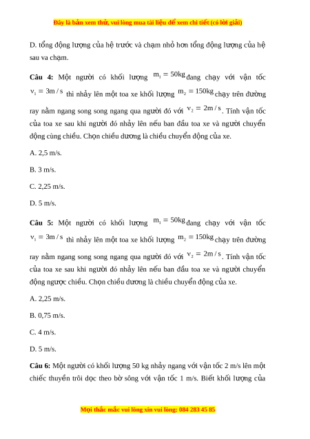 Đây là bản xem th , vu ử i lòng mua tài li u ệ đ xe ể m chi ti t (c ế ó l i ờ gi i ả ) D. t ng ổ đ ng ộ lư ng ợ c a ủ hệ trư c ớ và ch m ạ nh ỏ h n ơ t ng ổ đ ng ộ lư ng ợ c a ủ hệ sau va ch m ạ . Câu 4: M t ộ ngư i ờ có kh i ố lư ng ợ m 50kg 1 đang ch y ạ v i ớ v n ậ t c ố 3m / s m 150kg 1 thì nh y ả lên m t ộ toa xe kh i ố lư ng ợ 2 ch y ạ trên đư ng ờ ray n m