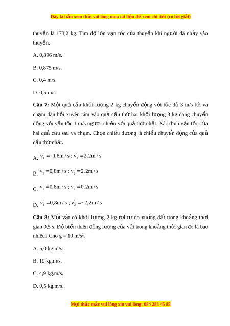 ề là 173,2 kg. Tìm độ l n ớ v n ậ t c ố c a ủ thuy n ề khi ngư i ờ đã nh y ả vào thuy n. ề A. 0,896 m/s. B. 0,875 m/s. C. 0,4 m/s. D. 0,5 m/s. Câu 7: M t ộ quả c u ầ kh i ố lư ng ợ 2 kg chuy n ể đ ng ộ v i ớ t c ố độ 3 m/s t i ớ va ch m ạ đàn h i ồ xuyên tâm vào quả c u ầ thứ hai kh i ố lư ng ợ 3 kg đang chuy n ể đ ng ộ v i ớ v n ậ t c ố 1 m/s ngư c ợ chi u ề v i ớ qu ả th ứ nh t ấ . Xác đ nh ị v n ậ t c ố c a ủ hai quả c u ầ sau va ch m ạ . Ch n ọ chi u ề dư ng ơ là chi u ề chuy n ể đ ng ộ c a ủ quả cầu th nh ứ t ấ . ' ' A. 1,8m / s ; ν 2 ,2m / s 1 2 ' ' B. 0 ,8m / s ; ν 2 , 2m / s 1 2 ' ' C. 0 ,8m / s ; ν 0 ,2m / s 1 2 ' ' D. 0