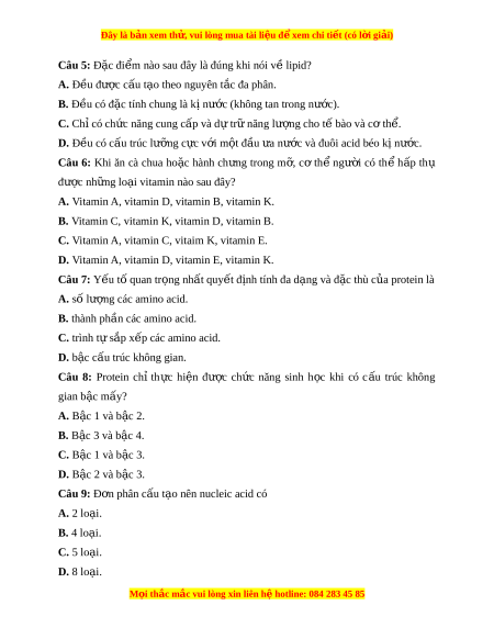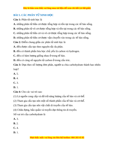 ê vào trong các tê bào sống. Câu 2: Đi m ê chung gi a các ữ phân t s ử inh h c ọ là A. đ u đ ê ư c c ợ âu t o t ạ heo nguyên t c đa phân. ă B. đ u co t ê hành ph n hoa h â c ọ ch y u u l ê à carbon và hydrogen. C. đ u co hàm ê lư ng gi ợ ống nhau t ơ rong t bào. ê D. đ u co cung s ê ố nguyên t car ử bon t ơ rong c u t â ruc. Câu 3: D a ự theo số lư ng ợ đ n ơ phân, ngư i