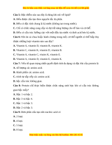 D. Vitamin A, vitamin D, vitamin E, vitamin K. Câu 7: Y u t ê ố quan tr ng ọ nhât quy t ê đ nh t ị ính đa d ng ạ và đ c t ă hu c a u protein là A. số lư ng ợ các amino acid.