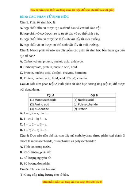 D. Protein, nucleic acid, lipid, acid h u c ư , vi ơ tamin. Câu 3: Nôi đ n ơ phân (c t ô A) v i ơ phân t ư sinh h c o tư ng ơ ng ư (c t ô B) đ đ ê ư c ơ n i ô dung đung. Cột A Cột B (1) Monosaccharide (a) Nucleic acid (2) Amino acid (b) Polysaccharide (3) Nucleotide (c) Protein