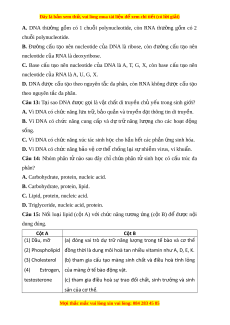 D. Triglyceride, nucleic acid, protein. Câu 15: N i ô lo i a lipid (c t ô A) v i ơ ch c ư năng tư ng ơ ng ư (c t ô B) đ ê đư c ơ n i ô dung đung. Cột A Cột B (1) Dầu, mỡ