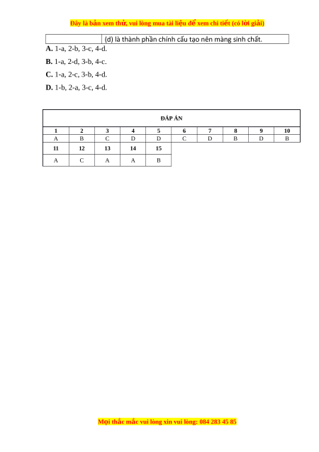 D. 1 – b; 2 – a; 3 – c. Câu 4: D a