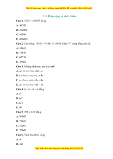 Câu 1. 5125 + 456875 bằng A. 46200 B. 462000 C. 46300 D. 426000