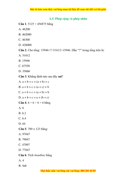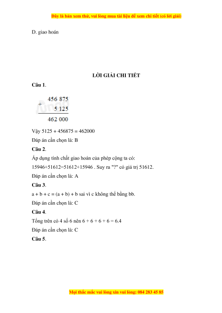 LỜI GIẢI CHI TIẾT Câu 1. Vậy 5125 + 456875 = 462000 Đáp án cần chọn là: B Câu 2.