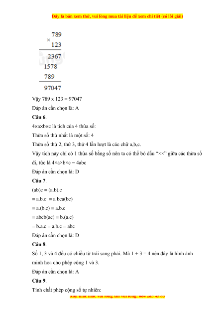 Câu 5. 789 × 123 bằng: A. 97047 B. 79047 C. 47097 D. 77047