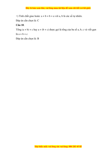 Câu 10. Tổng (a + b) + c hay a + (b + c) được gọi là tổng của ... và viết gọn là a + b + c. A. kết hợp B. ba số a, b, c C. hai số a, b