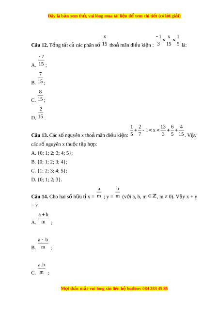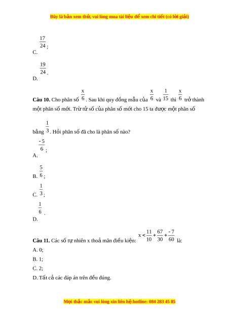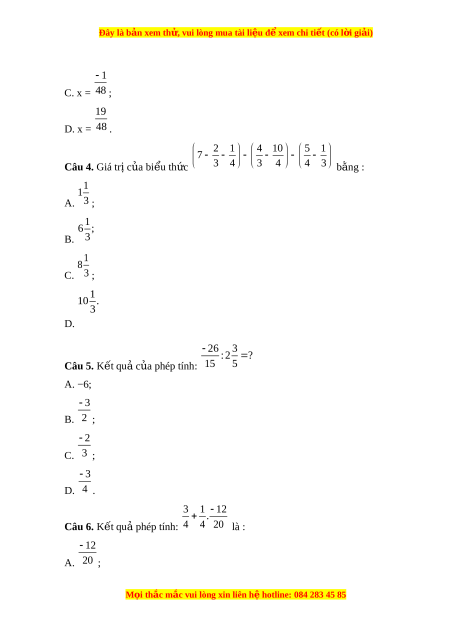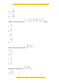 Đây là bản xem th , vu ử i lòng mua tài li u ệ đ xe ể m chi ti t ế (có l i ờ gi i ả ) 1 C. x = 48 ; 19 D. x = 48 . 2 1 4 10 5 1 7 Câu 4. Giá tr c ị a ủ bi u t ể h c ứ 3 4 3 4 4 3 b ng ằ : 1 1 A. 3 ; 1 6 ; B. 3 1 8 C. 3 ; 1 10 . 3 D. 26 3 : 2 ? Câu 5. K t ế qu c ả a ủ phép tính: 15 5 A. −6; 3 B. 2 ; 2 C. 3 ; 3 D. 4 . 3 1 12 . Câu 6. K t ế qu phép ả tính: 4 4 20 là : 12 A. 20 ; M i ọ thắc m c