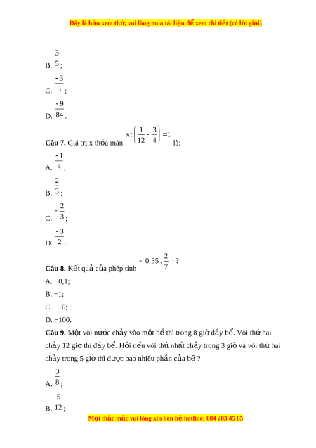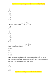 Đây là bản xem th , vu ử i lòng mua tài li u ệ đ xe ể m chi ti t ế (có l i ờ gi i ả ) 3 B. 5 ; 3 C. 5 ; 9 D. 84 . 1 3 x : 1 Câu 7. Giá tr x t ị h a ỏ mãn 12 4 là: 1 A. 4 ; 2 B. 3 ; 2 C. 3 ; 3 D. 2 . 2 0,35 . ? Câu 8. K t ế qu c ả a ủ phép tính 7 A. −0,1; B. −1; C. −10; D. −100. Câu 9. M t ộ vòi nư c ớ ch y ả vào m t ộ b t ể hì trong 8 gi đ ờ y b ầ . ể Vòi th hai ứ ch y 12 gi ả ờ thì đầy b . H ể i ỏ n u vòi ế th nh ứ t ấ ch y t ả rong 3 gi và vòi ờ th hai ứ ch y t ả rong 5 gi t ờ hì đư c ợ bao nhiêu ph n c ầ a b ủ ? ể 3 A. 8 ; 5 B. 12 ; M i ọ thắc m c