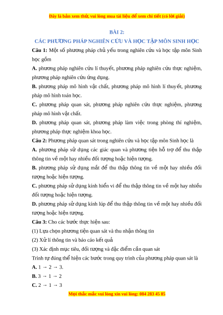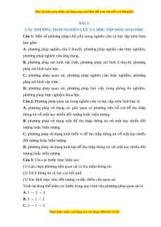 Đây là bản xem th , vu ử i lòng mua tài li u ệ đ xe ể m chi ti t ế (có l i ờ gi i ả ) BÀI 2: CÁC PHƯ N Ơ G PHÁP NGHIÊN C U Ứ VÀ H C Ọ T P Ậ MÔN SINH H C Ọ Câu 1: M t ô sô phư ng ơ pháp ch u y u ê trong nghiên c u ứ va h c o t p â môn Sinh h c g o ôm A. phư ng ơ pháp nghiên c u ứ li thuy t ê , phư ng ơ pháp nghiên c u ứ th c ư nghi m ê , phư ng pháp nghi ơ ên c u ứ ng d ứ ng. u B. phư ng ơ pháp mô hinh v t â ch t â , phư ng ơ pháp mô hinh li thuy t ê , phư ng ơ pháp mô hinh toán h c. o C. phư ng ơ pháp quan sát, phư ng ơ pháp nghiên c u ứ th c ư nghi m ê , phư ng ơ pháp mô hinh v t â ch t â . D. phư ng ơ pháp quan sát, phư ng ơ pháp lam vi c ê trong phòng thi nghi m ê , phư ng pháp t ơ h c ư nghi m ê khoa h c. o Câu 2: Phư ng